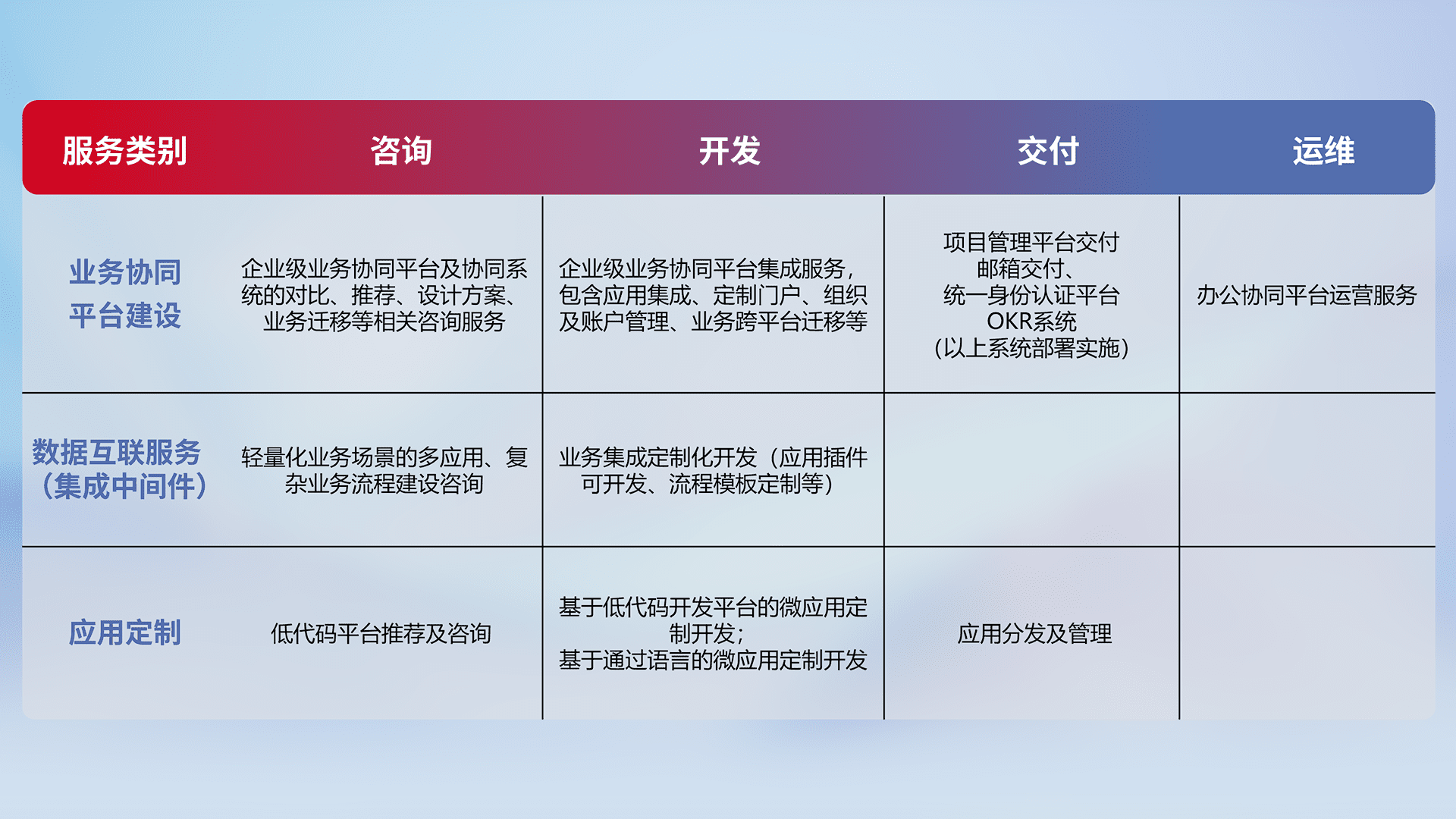 针对钉钉、、、、企微、、IDaas等平台级产品提供产品的规划、、、、方案、、交付、、、定制化开发等服务,,,实现如统一协同办公、、智能客户服务、、、混合会议管理、、、智能数据查询、、、、等业务场景,,,,实现数字化转型。。。